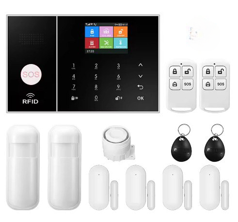 - Central panel, 2 motion sensors, 4 door/window sensors, 1 siren, 2 key fobs, 2 RFID tags