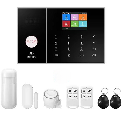 - Central panel, 1 motion sensor, 1 door/window sensor, 1 siren, 2 key fobs, 2 RFID tags